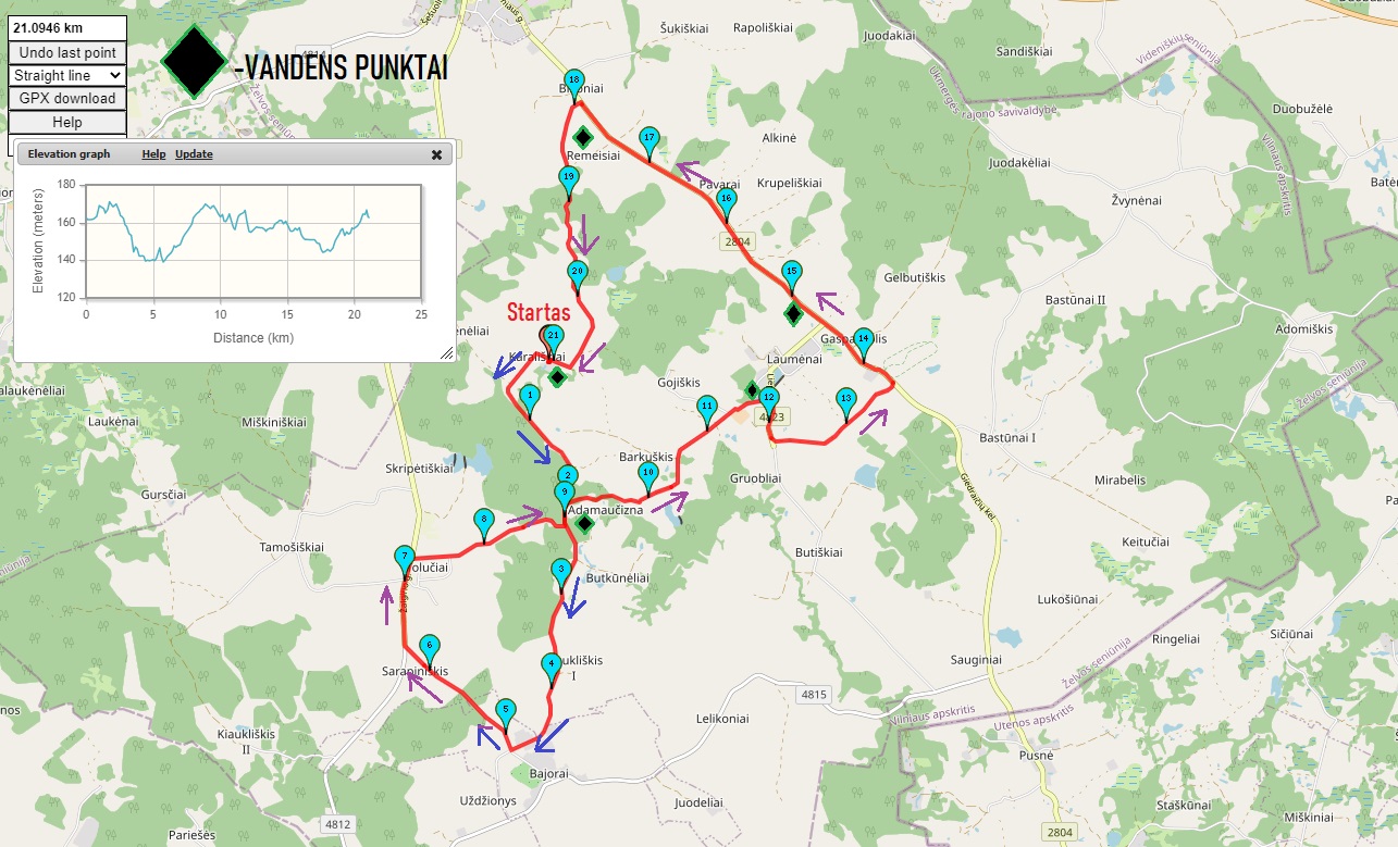 Pusmaratonio bėgikai bėgs vieną ratą, vandens stotelės bus 2km, 6km, 9km,12km, 15km, 18km, 21km. Keliose vandens stotelėse bus savitarna.