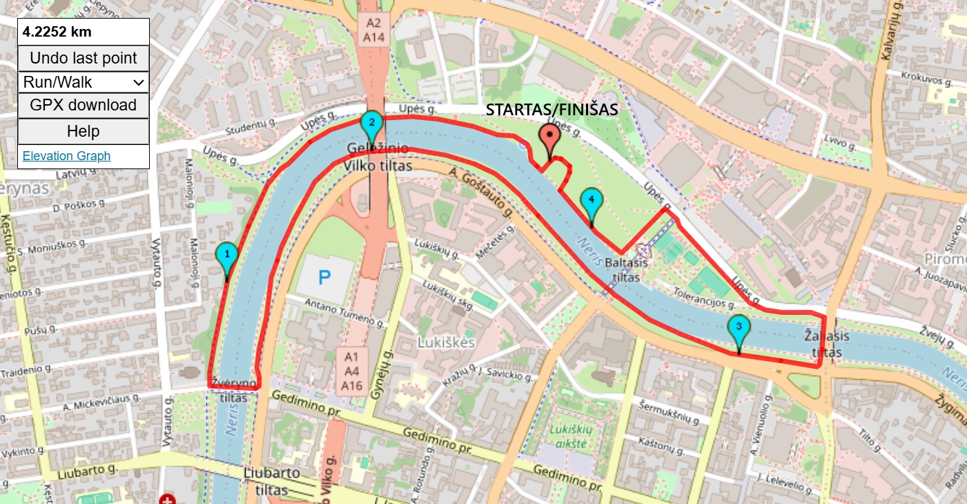 Ratas – 4.22 km. Startas/finišas – laisvalaikio erdvė prie Baltojo tilto
